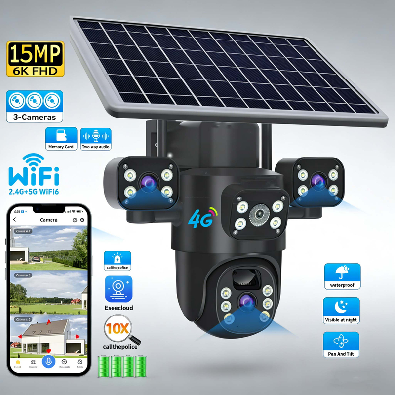 | 15MP 4G solar outdoor WiFi camera with 3-lens 3-screen, PTZ 360° view, PIR AI human detect & adaptive power. IP66 waterproof, 10X zoom, 2-way audio, ideal for off-grid outdoor security. | |||||||||
