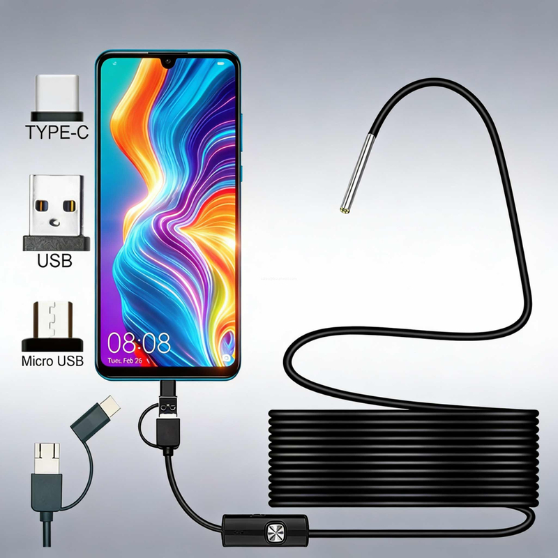 Cable and Power Supply: Comes with a 1-meter rigid cable that can reach into narrow spaces such as pipelines. The device is powered by DC 5V, compatible with conventional power supplies and device interfaces.