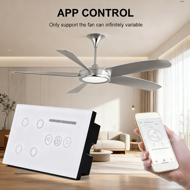 | 4Gang WiFi Touch Smart Switch with Fan Speed Control supports Tuya APP remote, voice control (Alexa/Google), 24-speed fan adjust & power stats. 95V0 fireproof, waterproof for Home Automation. | |||||||||