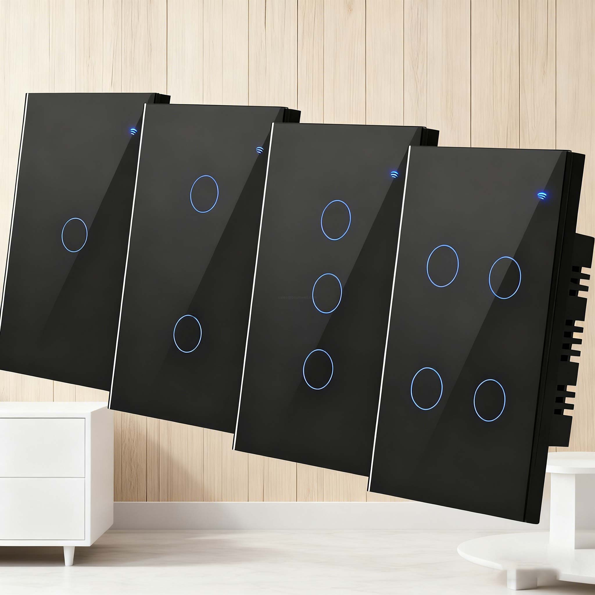 | WiFi 433MHz Smart Wall Touch Switch supports voice control (Alexa/Google), remote APP operation (off-home), easy 2-wire install. RF works without WiFi, group control, ideal for smart home lighting. | |||||||||
