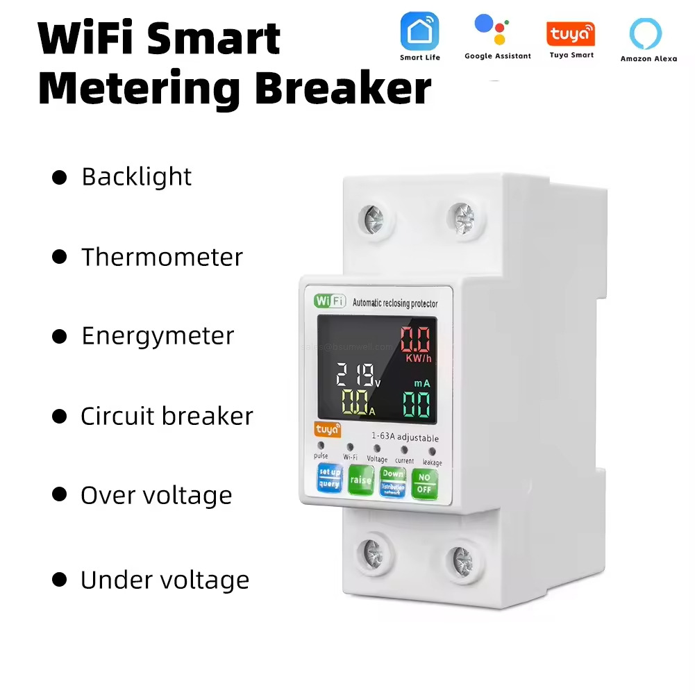 | WiFi Smart Energy Meter Circuit Breaker 63A: Tuya App remote control, voice control (Alexa/Google), adjustable overvoltage/leakage protection, kWh metering, timing schedule. CE certified for home/industrial electrical management. | |||||||||